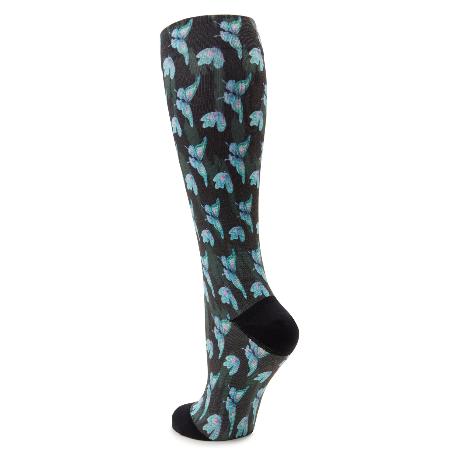 Alegria has created the ultimate comfort companion for our amazingly comfortable shoes. Our first compression sock is made from soft nylon and comfortable stretch spandex that is adorned with our colorful prints, featured here in Butterfly. Graduated compression zones for the best circulation, allowing for support in the areas where you need it most. The cuff is non-binding so it gently hugs your calf but gives you all day support.