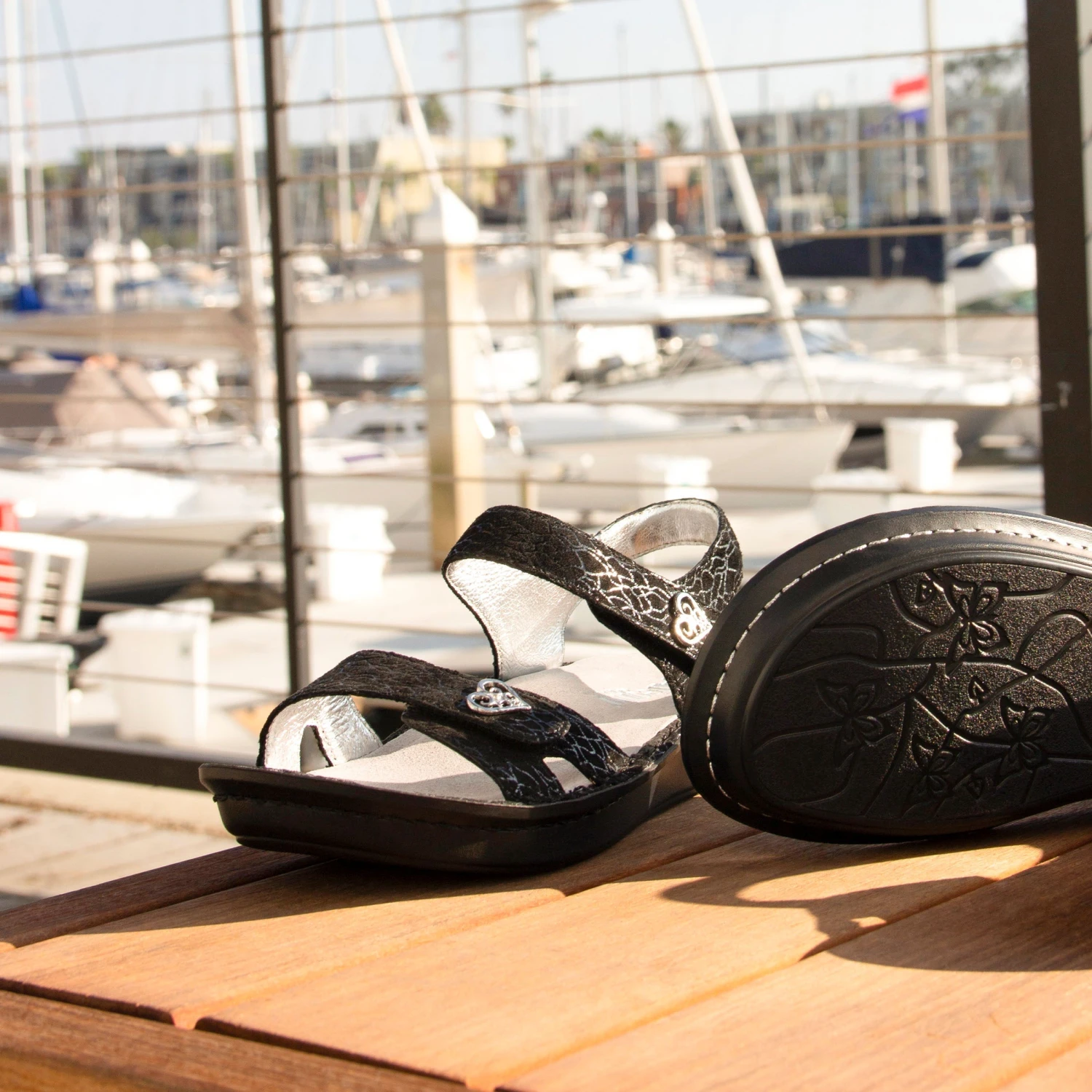 A touch of elegance sets this adjustable strap leather sandal apart, detailed with novelty embellishments for some extra polish. The removable memory foam and cork footbed with the mini outsole combine for a perfect balance of comfort and style.ย